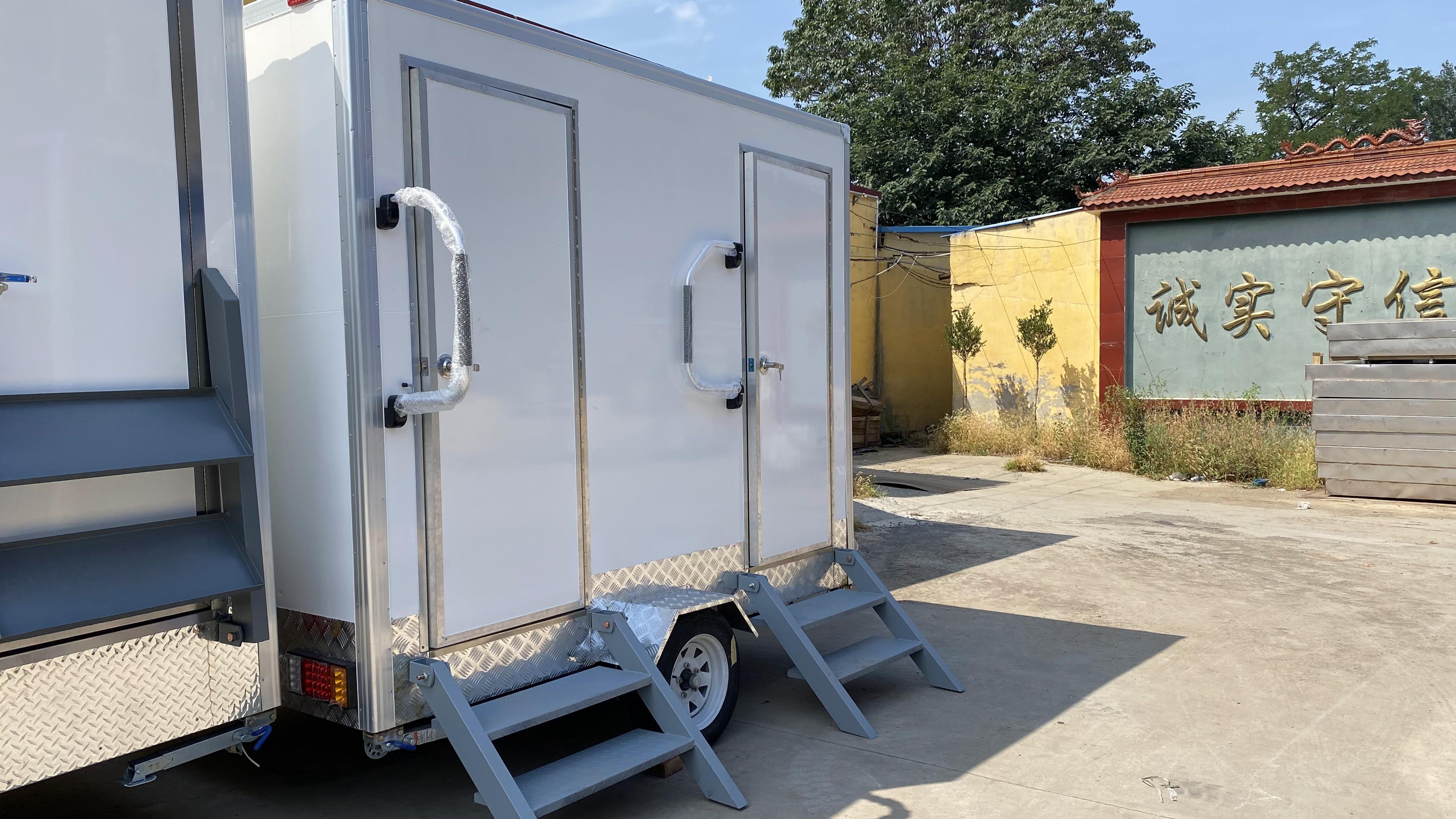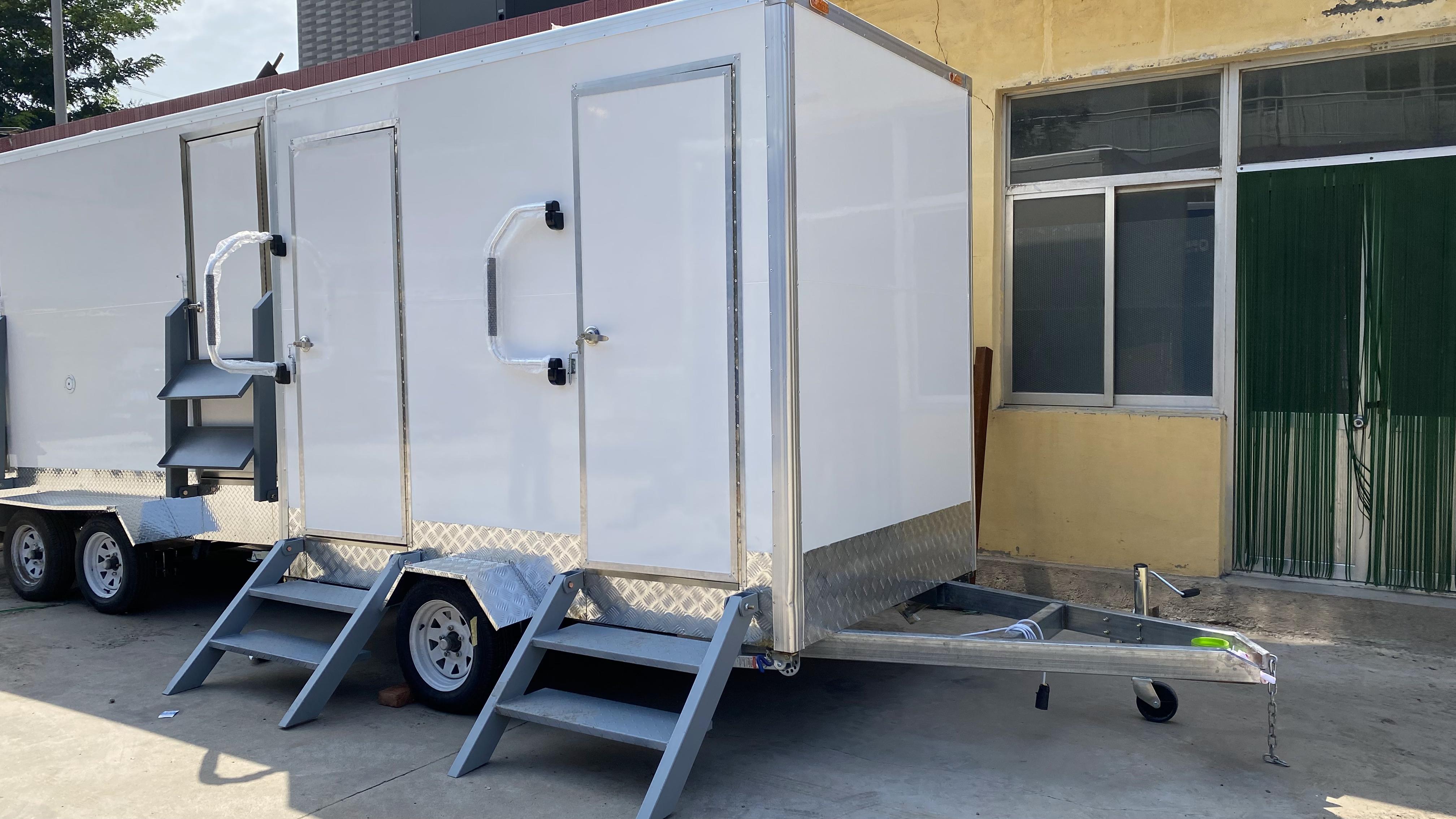 Mobile trailer-type multi-door portable bathroom with black and gold texture outdoor temporary bathroom trailer